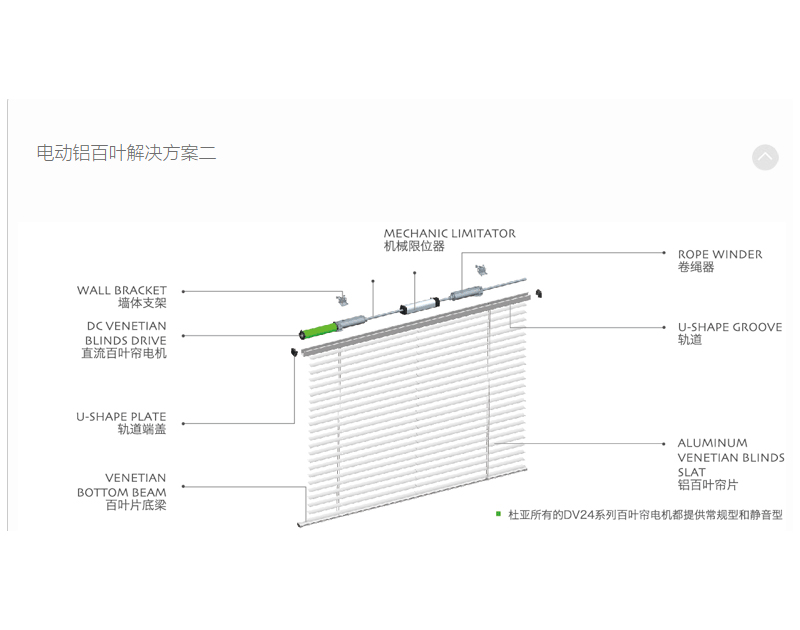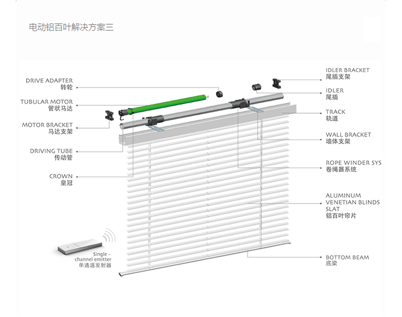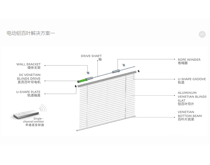 MotorizedAluminiumVenetianBlinds電動(dòng)鋁百葉室內(nèi)電動(dòng)鋁百葉使用鋁合金簾片,通過(guò)卷繩系統(tǒng)帶動(dòng)簾體的上下運(yùn)行及簾片翻轉(zhuǎn),起到光線調(diào)節(jié)與