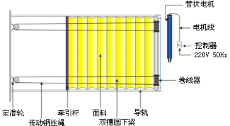 電動(dòng)FCS折疊式天棚簾是面料折疊單循環(huán)牽引機(jī)構(gòu)。利用管狀電機(jī)旋轉(zhuǎn)帶動(dòng)卷管及固定在卷管上的卷繩器旋轉(zhuǎn)從而使一根鋼絲進(jìn)行收放。傳動(dòng)鋼絲繩通過滑輪進(jìn)行換向,使一根鋼絲