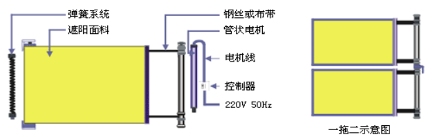 FSS天棚簾即單電機(jī)彈性機(jī)構(gòu)天棚簾,該系統(tǒng)專為水平或傾斜遮陽系統(tǒng)而設(shè)計(jì),適合于水平、傾斜或彎曲的玻璃天棚。主要由管狀電機(jī)和彈性張力系統(tǒng)組成,面料一直經(jīng)受張力,機(jī)構(gòu)一端用一臺(tái)管狀系列馬達(dá),另一端用強(qiáng)力彈簧機(jī)構(gòu)。在天棚收放過程中面料始終保持平挺。該機(jī)構(gòu)工作原理是利用電機(jī)作為動(dòng)力,通過在一根卷管內(nèi)的電機(jī)的轉(zhuǎn)動(dòng)與另一卷管內(nèi)的彈簧機(jī)構(gòu)相互作用產(chǎn)生張力,通過鋼繩牽引,面料隨之開啟和閉合。當(dāng)電機(jī)正轉(zhuǎn)時(shí),克服彈簧阻力,將面料拉出;當(dāng)電機(jī)反轉(zhuǎn)時(shí),彈簧機(jī)構(gòu)利用儲(chǔ)存的彈性勢能,將面料卷回。適應(yīng)工程的需要,使遮陽機(jī)構(gòu)的利用率最優(yōu)化。